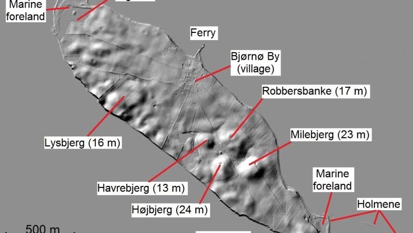 Secondly, Bjørnø is quite hilly relative to its small size. When the last ice advance stagnated and the dead-ice started melting, several water-filled hollows emerged on the surface of – or between – the melting ice masses. These hollows were filled with meltwater sediments, and when the ice had melted away, the filled-up hollows remained as hills. Such hills – which constitute some of the highest points on Bjørnø today – are known as kame hills. Some of the lowest points on the island have become fens and ponds.